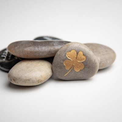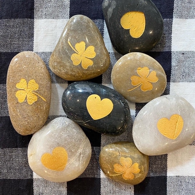 Petit porte-bonheur en pierre décoré d'un motif trèfle ou coeur.