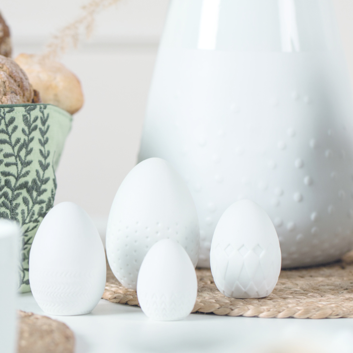 Un set de quatre œufs en porcelaine avec des tailles et des motifs en relief différent. Ces jolis œufs pourront décorer votre intérieur pour Pâques.